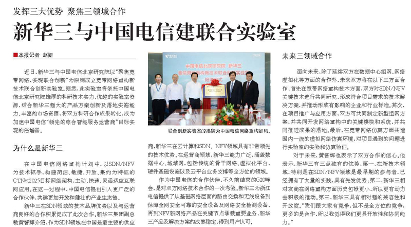 發(fā)揮三大優(yōu)勢 聚焦三領域合作 新華三與中國電信建聯(lián)合實驗室(《通信產(chǎn)業(yè)報》)